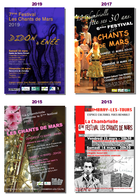 Le festival des « Chants de Mars », organisé salle Yves Renault à Chambray-lès-Tours de 2008 à 2019, a permis de produire aussi bien des formations amateurs que professionnelles dans des univers musicaux très divers : de la Musique Contemporaine à la Musique Classique ou Ancienne, du Jazz jusqu’au Baroque, de l’Opérette à l’Opéra, de la Chanson d’Humour aux Chansons « d’Amour et de Révolte », des Chants du Monde aux Chants Régionaux.